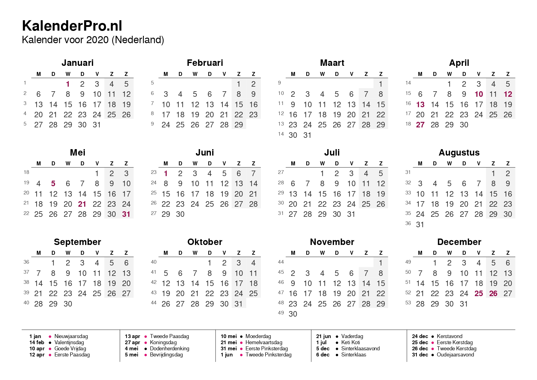 Zo heb je in één oogopslag alle dagen, weeknummers en feestdagen van 2020 bij de hand – altijd overzichtelijk en makkelijk te gebruiken.
