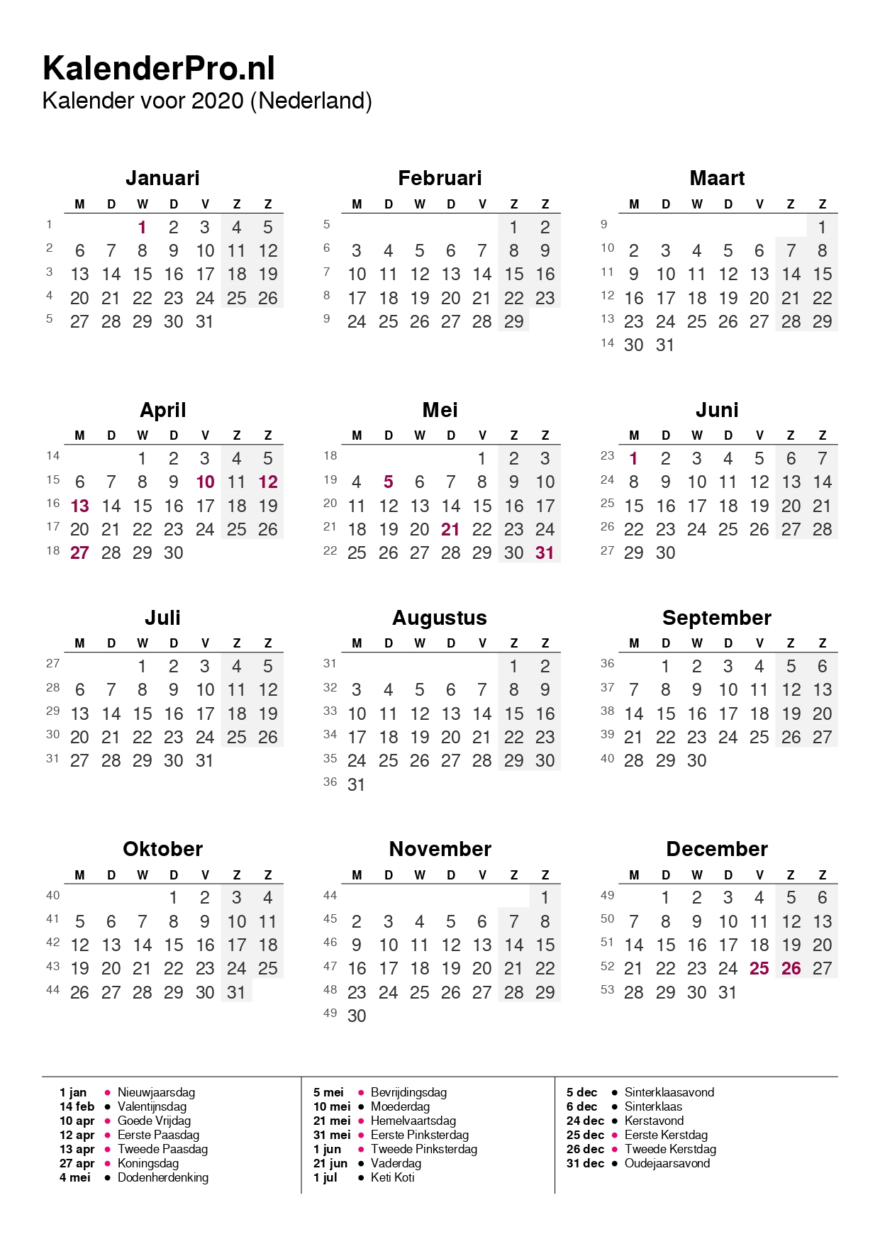 De kalender 2020 geeft je in één oogopslag een compleet overzicht van alle maanden, weeknummers en officiële feestdagen van het jaar. Of je nu wilt weten op welke dag een datum valt, je vakantie wilt plannen, of gewoon overzicht wilt houden over het jaar – hier vind je alles handig bij elkaar.