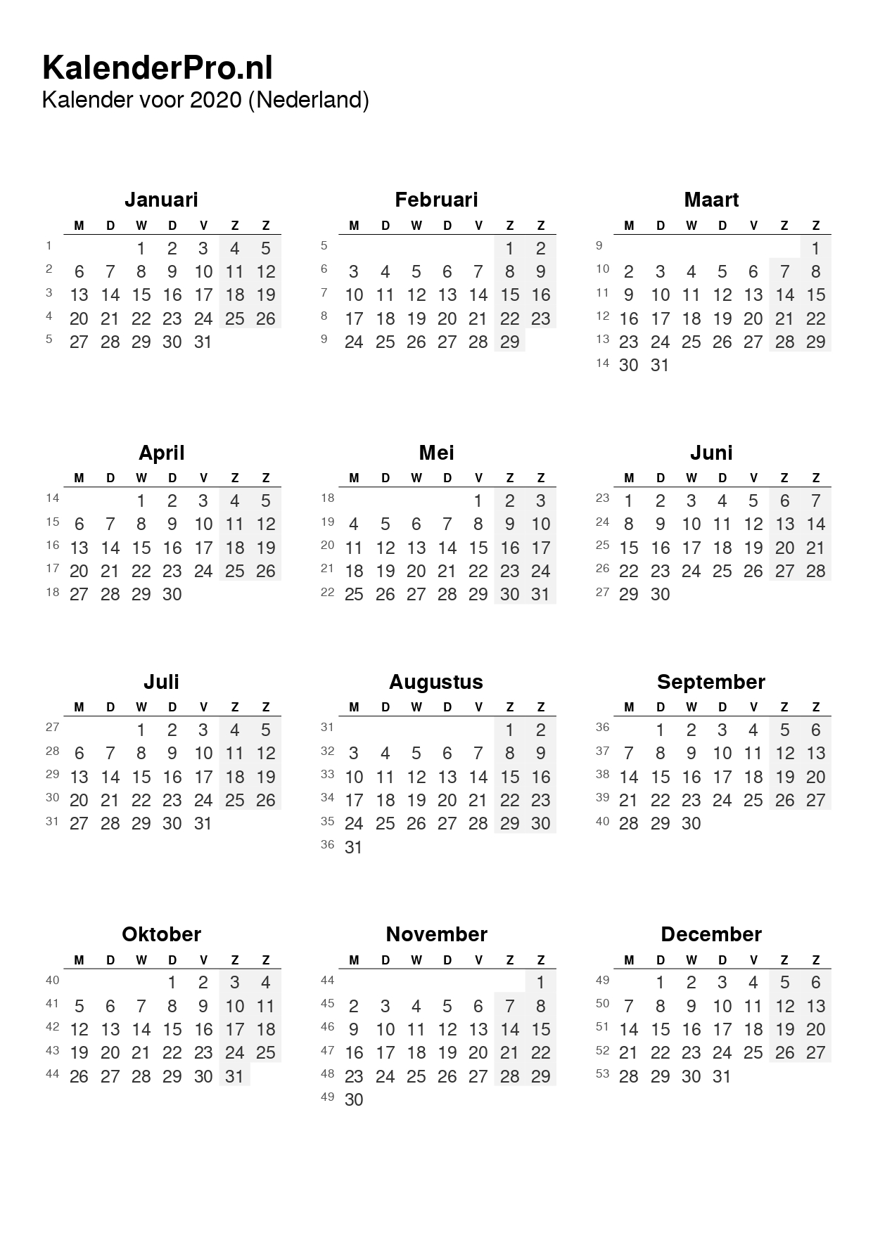 Je kunt eenvoudig doorklikken naar de maandkalenders van 2020, compleet met weeknummers en feestdagen voor elke maand.
