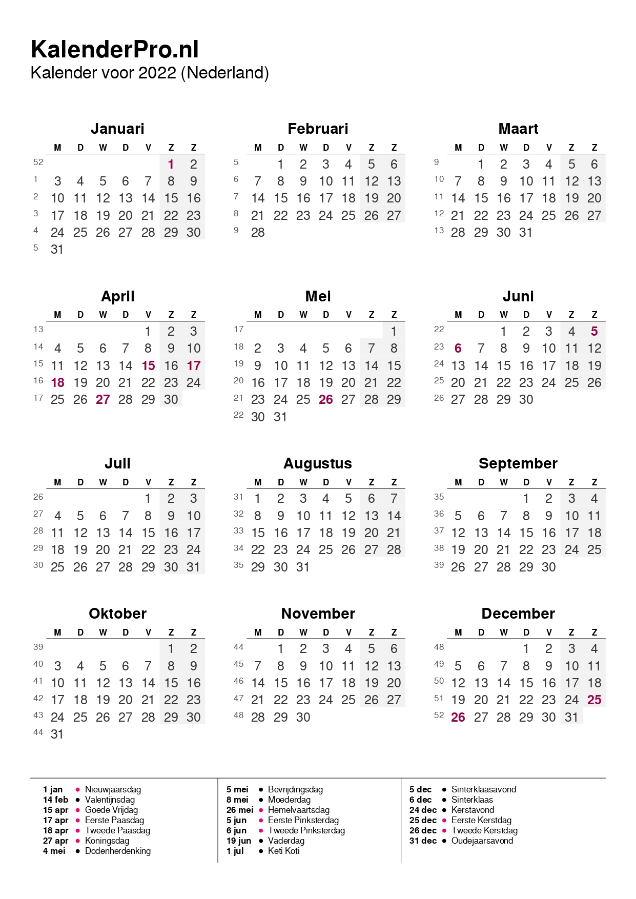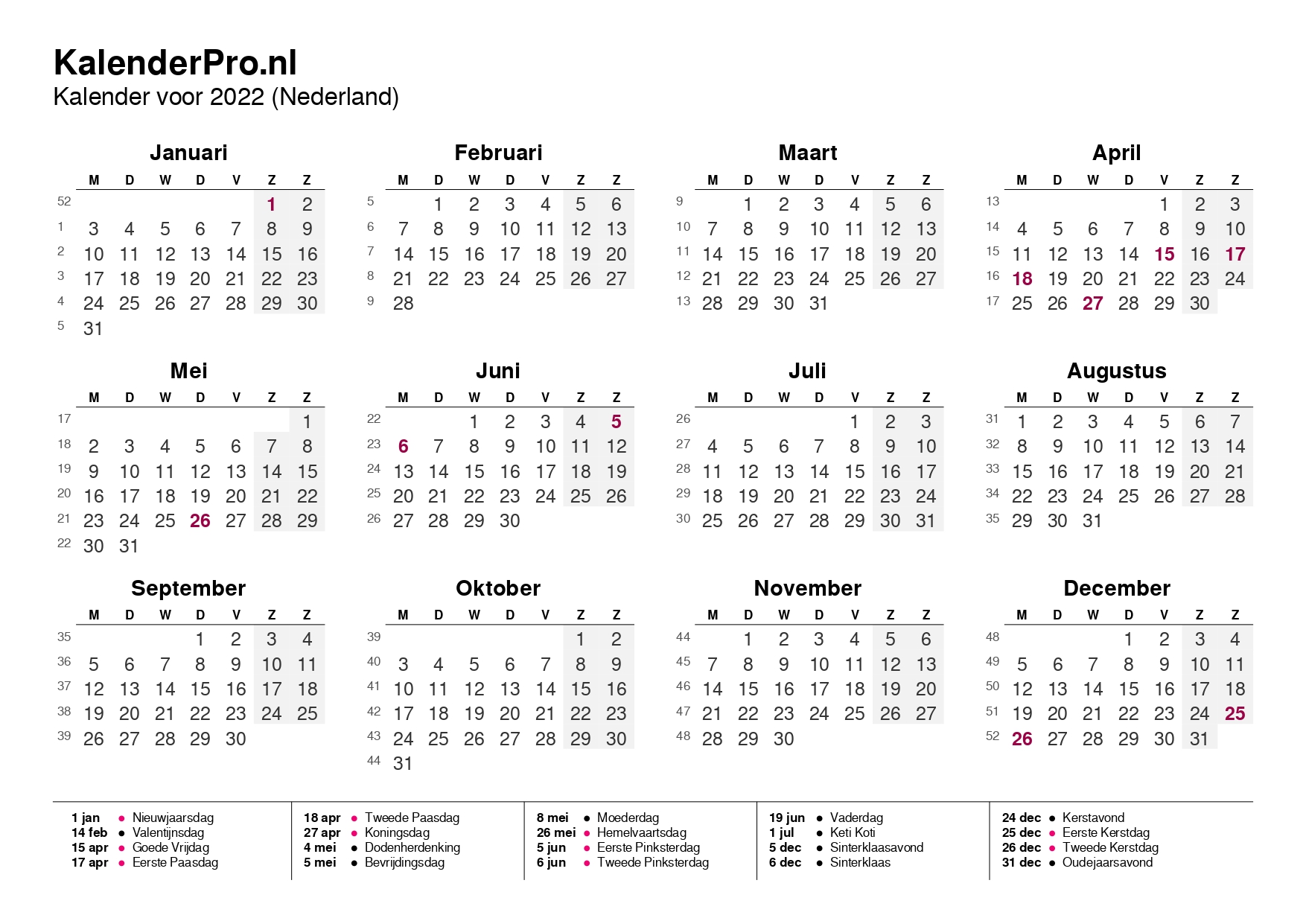 Zo heb je in één oogopslag alle dagen, weeknummers en feestdagen van 2022 bij de hand – altijd overzichtelijk en makkelijk te gebruiken.