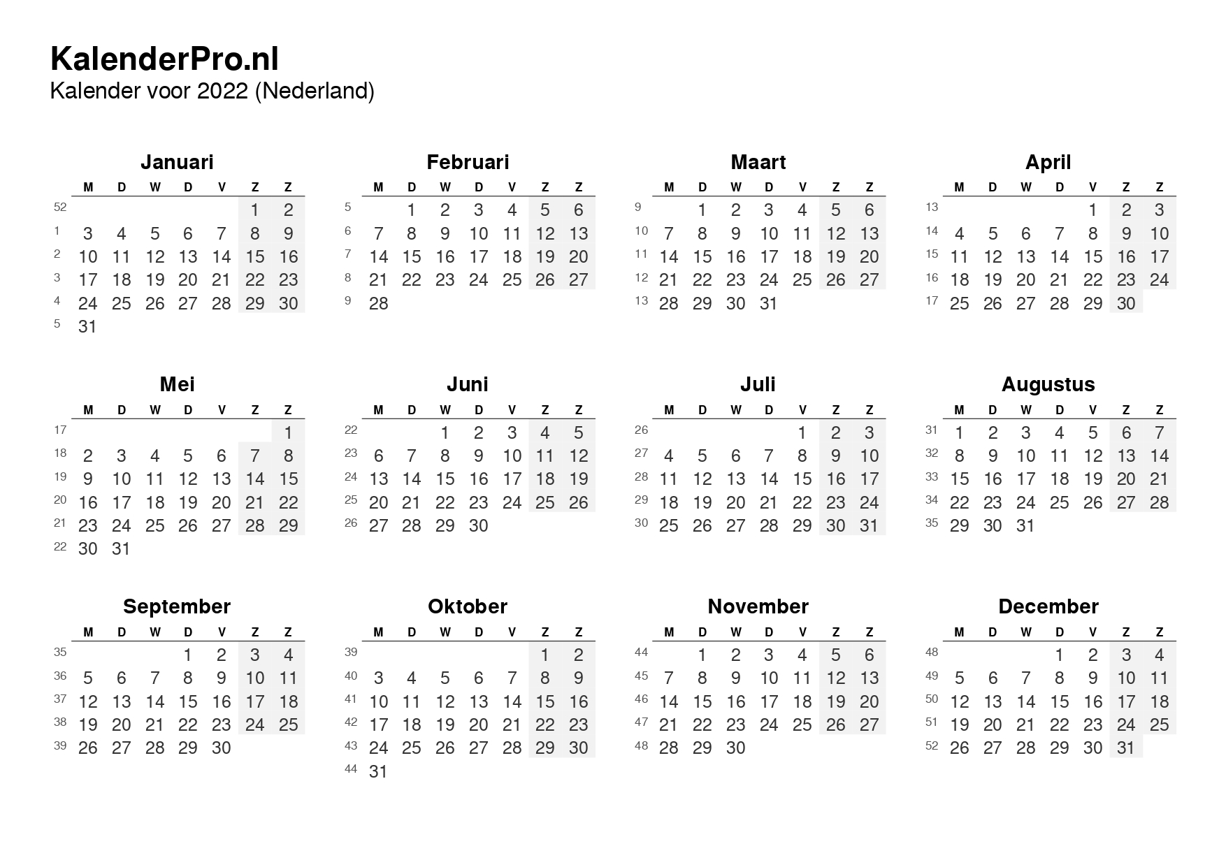 Download de kalender 2022 zonder feestdagen in liggend formaat op één overzichtelijke pagina. Ideaal voor wie liever een neutrale jaarkalender gebruikt voor eigen notities, werkroosters of persoonlijke planning.