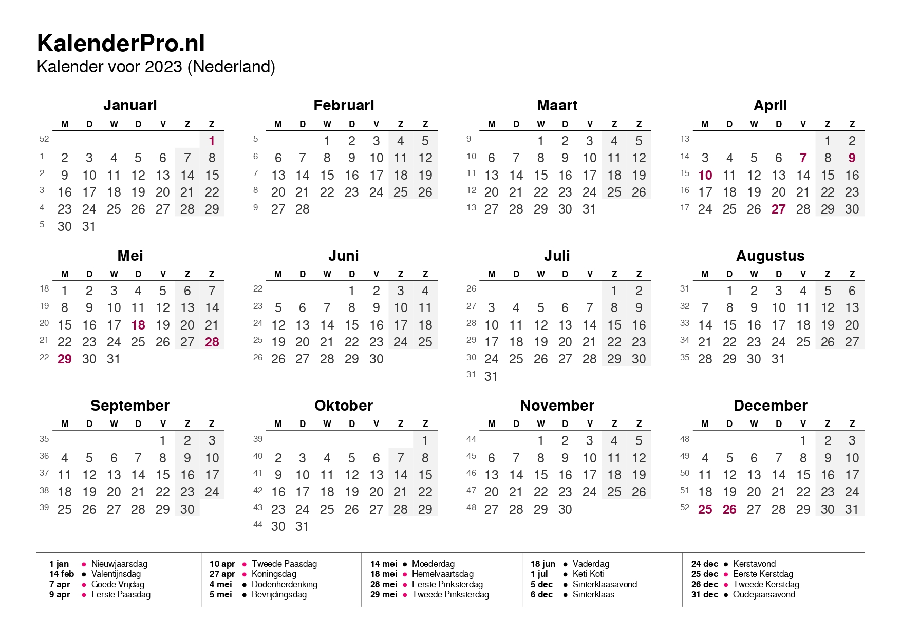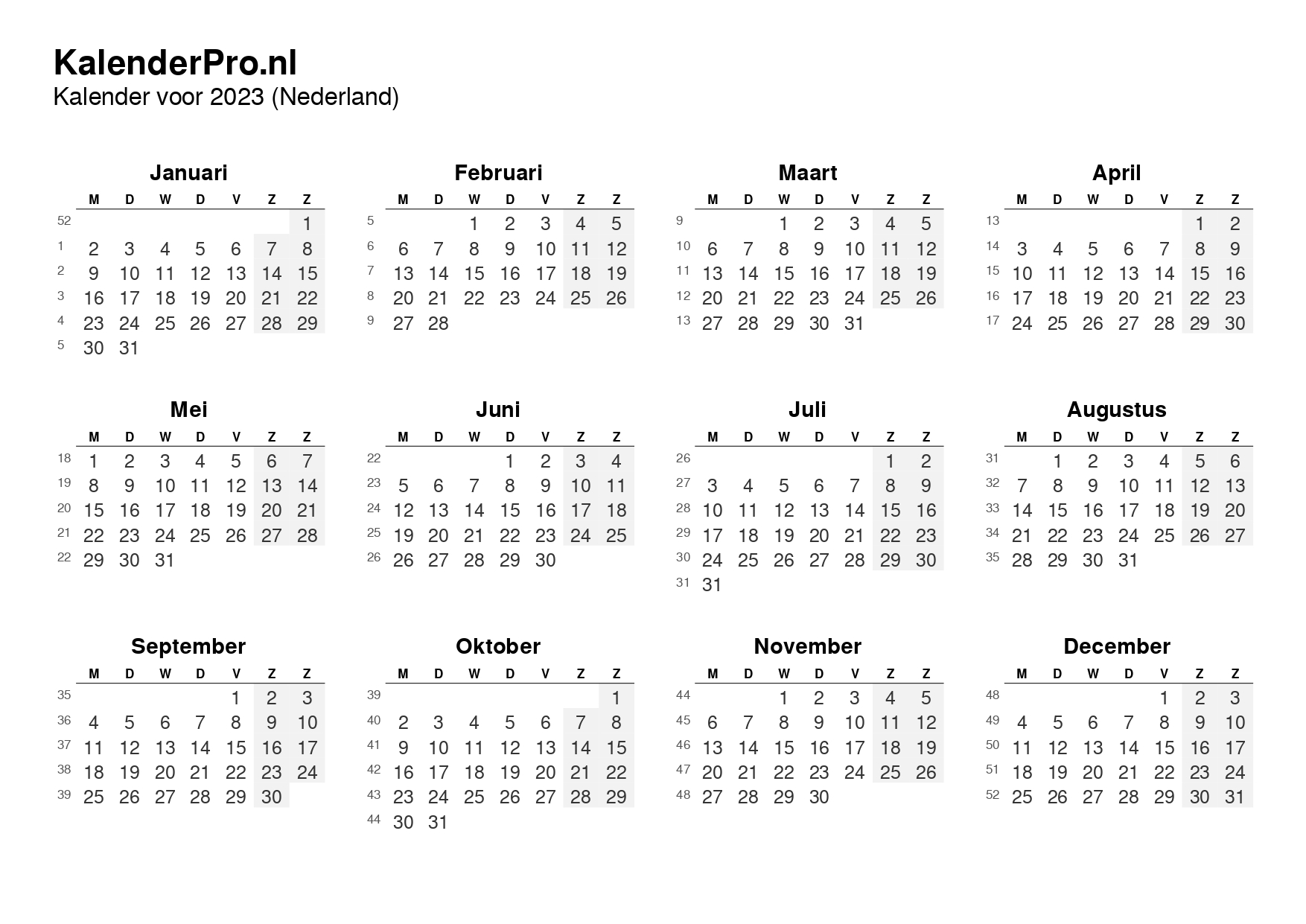 Zo heb je in één oogopslag alle dagen, weeknummers en feestdagen van 2023 bij de hand – altijd overzichtelijk en makkelijk te gebruiken.