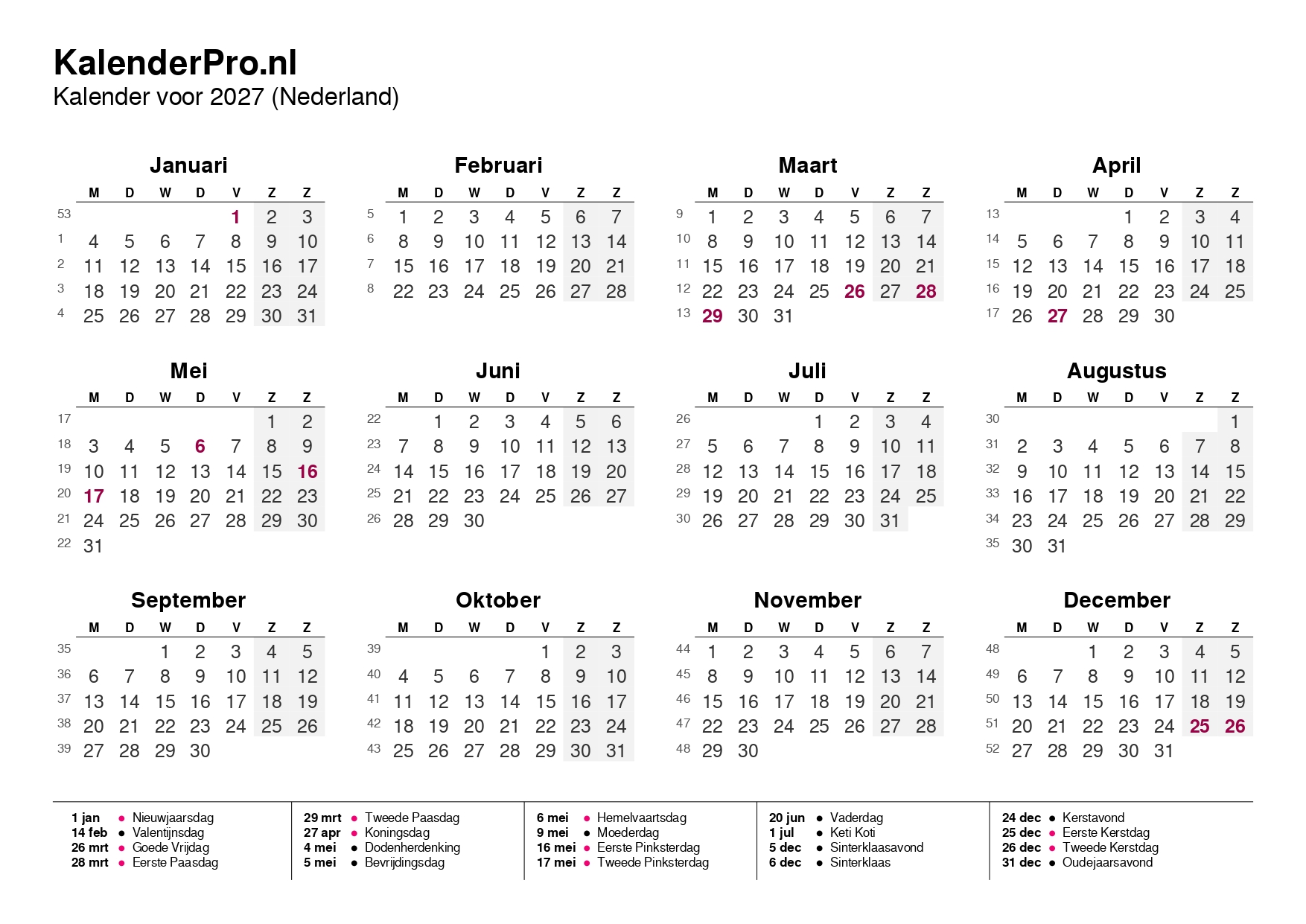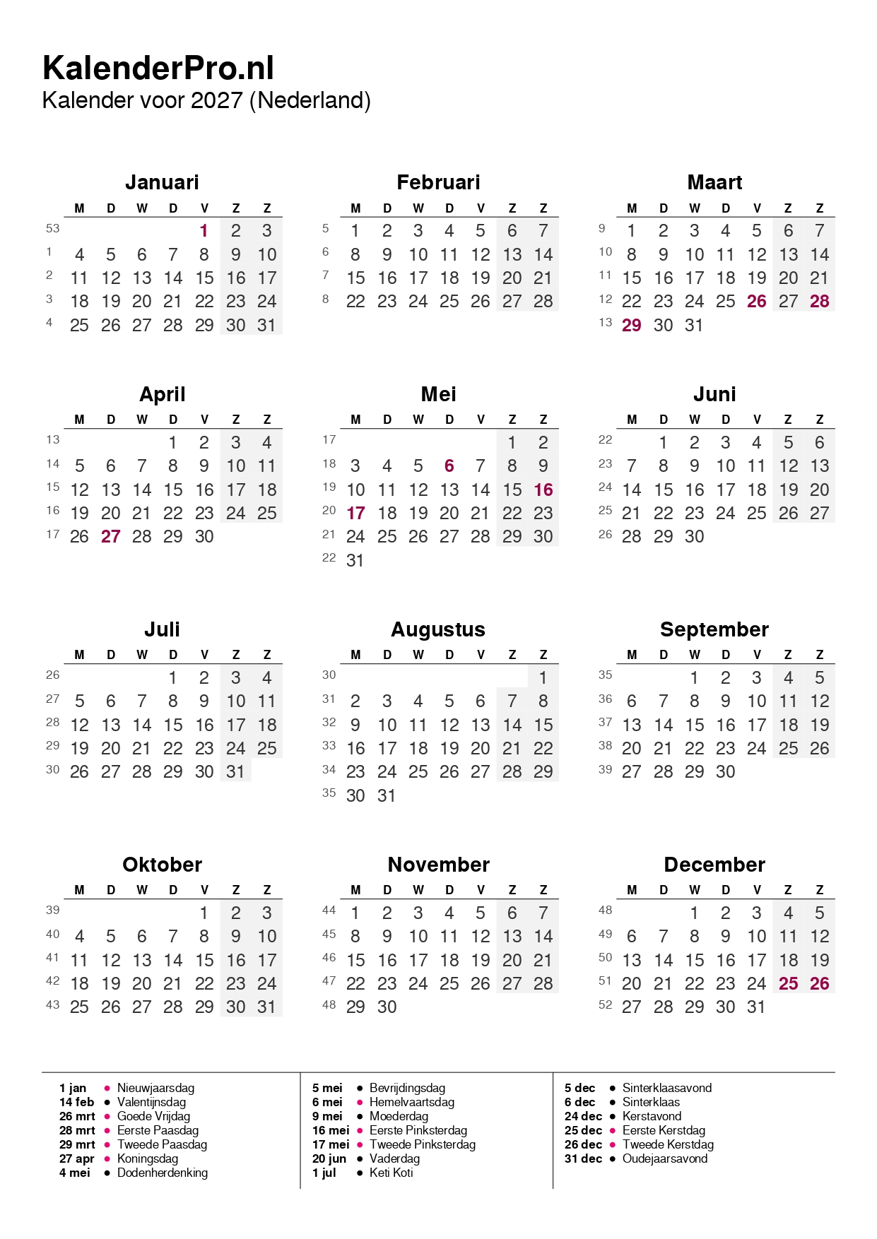 Bekijk hieronder het volledige overzicht van de kalender 2027: