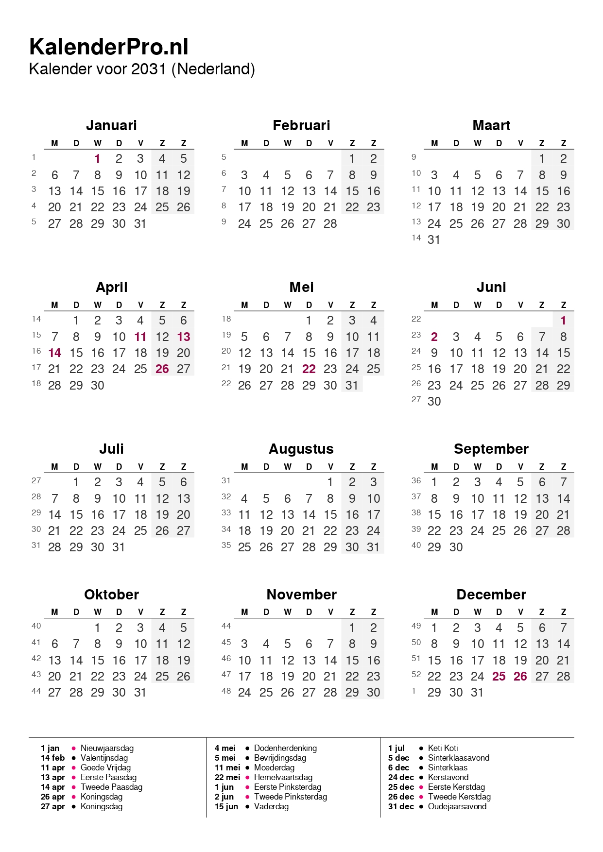 Wil je een duidelijke kalender 2031 met feestdagen om uit te printen voor thuis of op het werk?