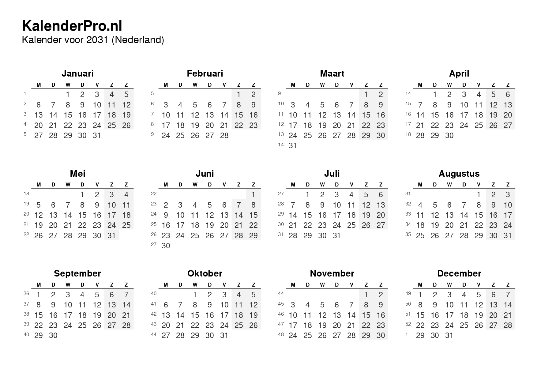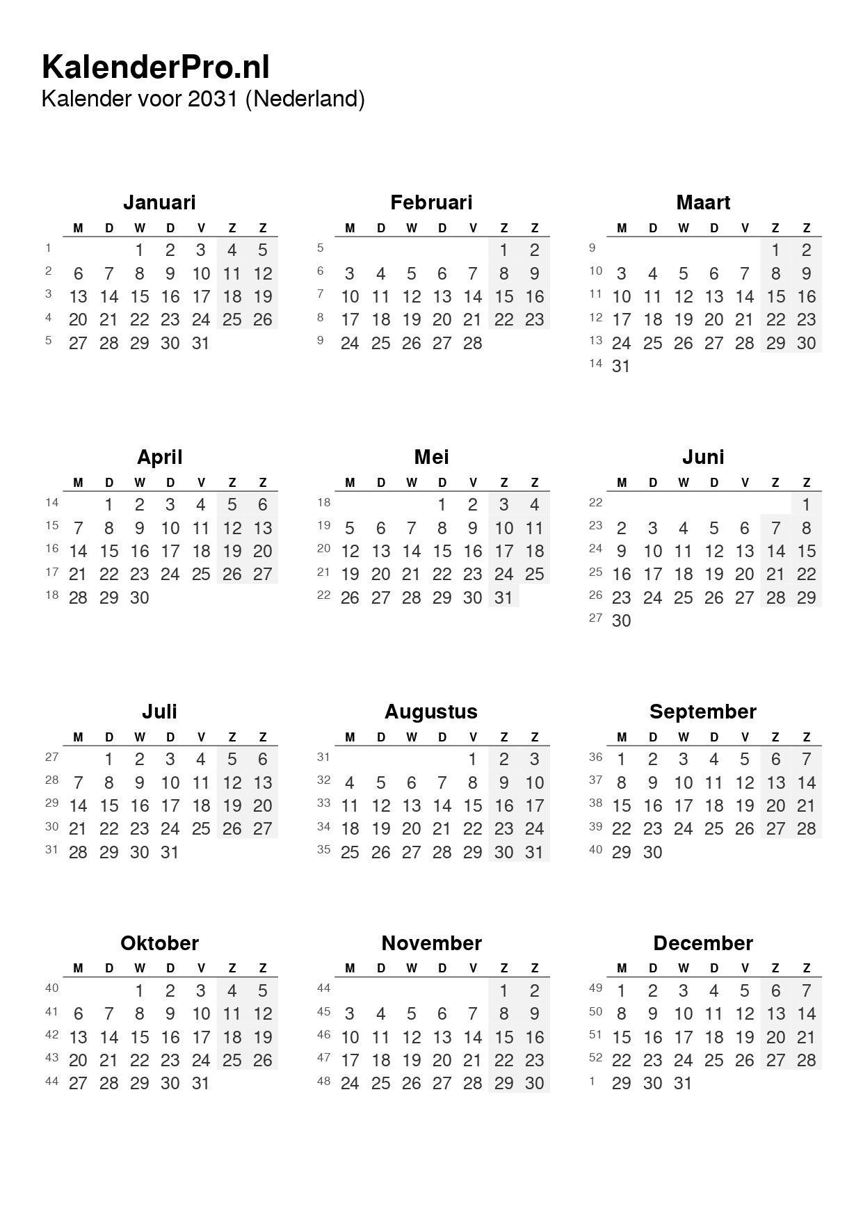 Bekijk hieronder het volledige overzicht van de kalender 2031: