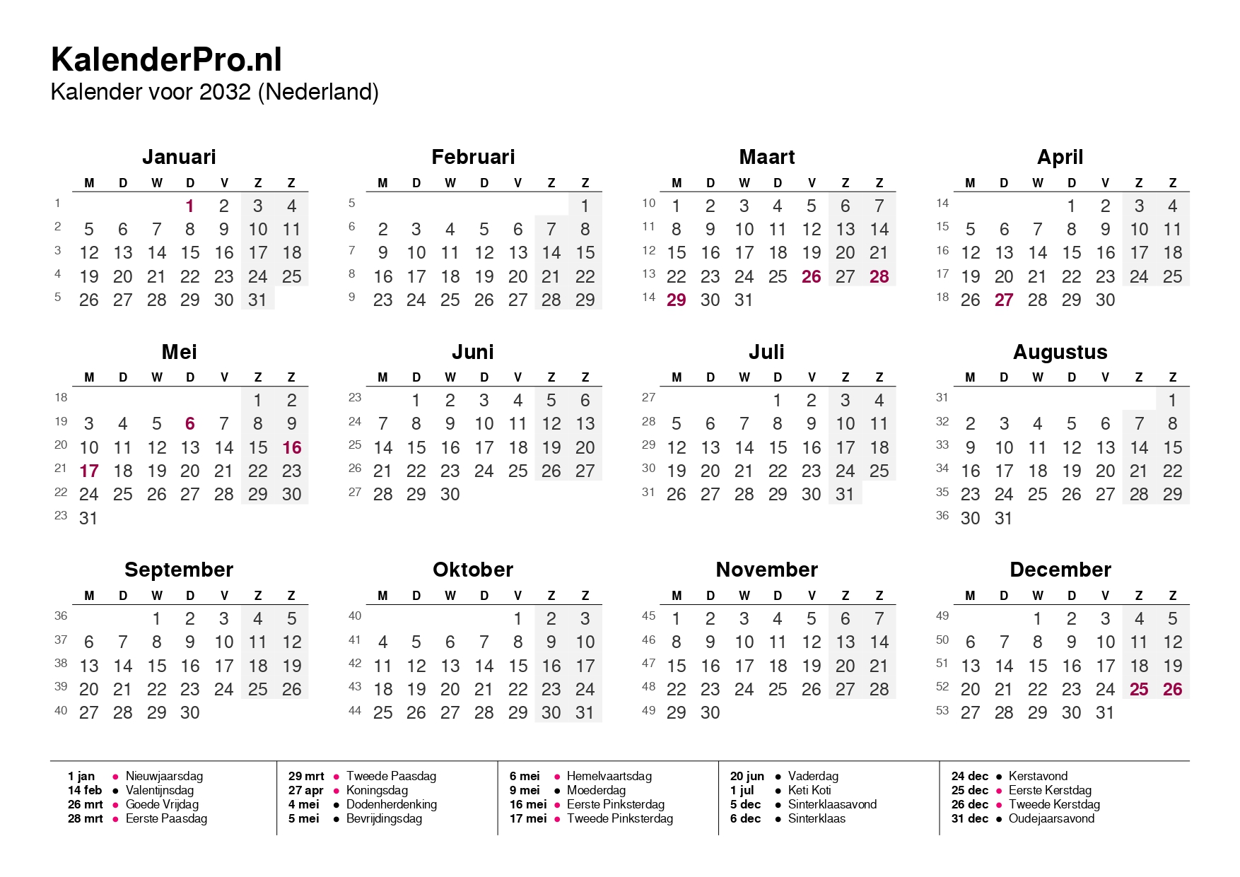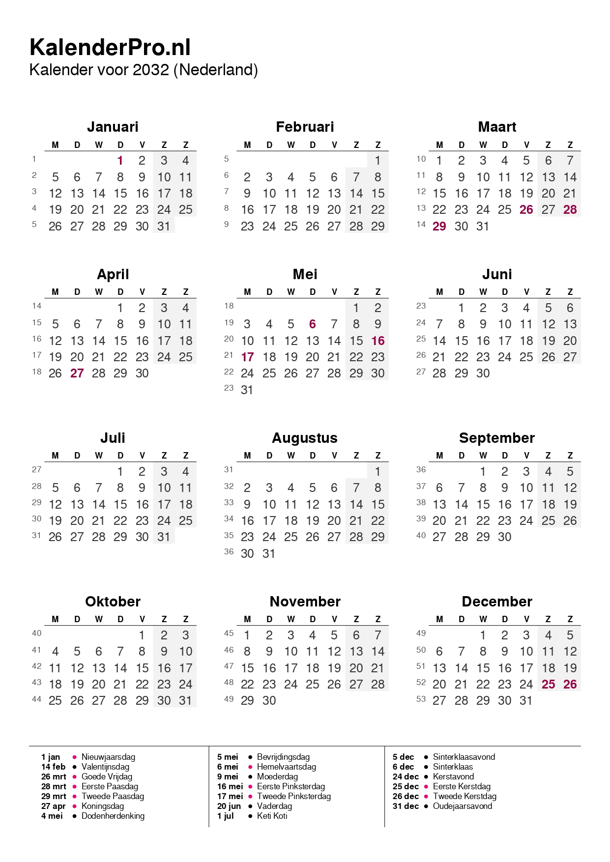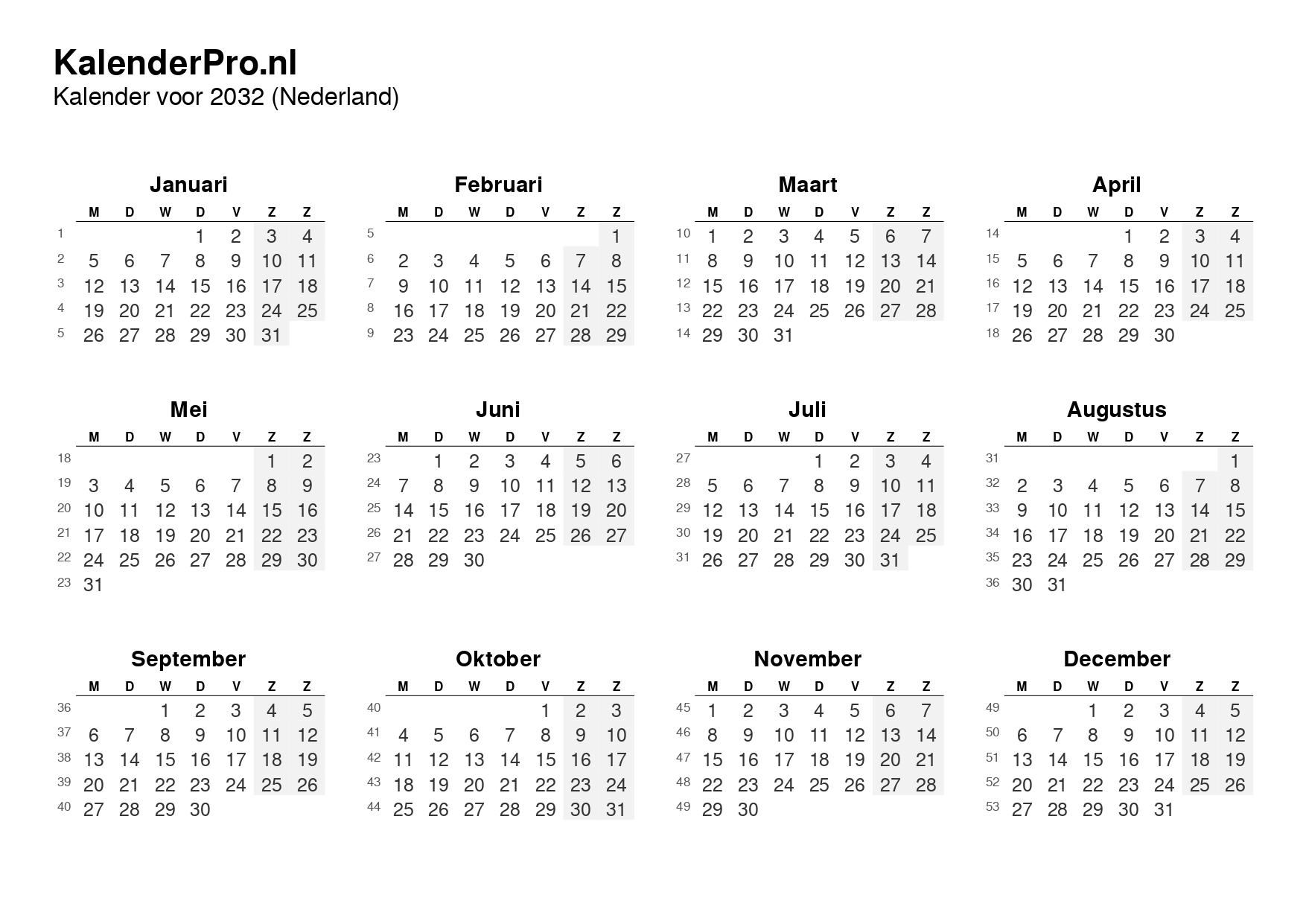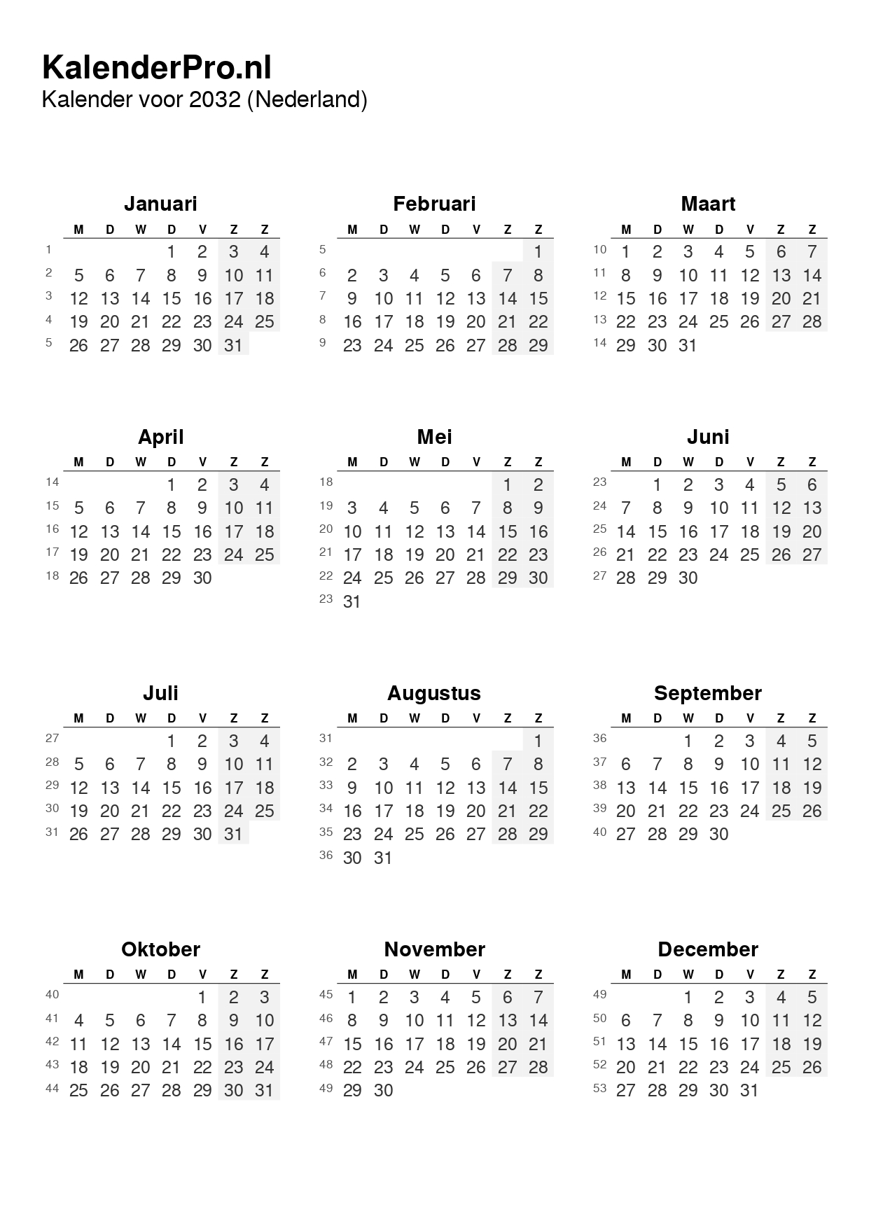 Bekijk hieronder het volledige overzicht van de kalender 2032: