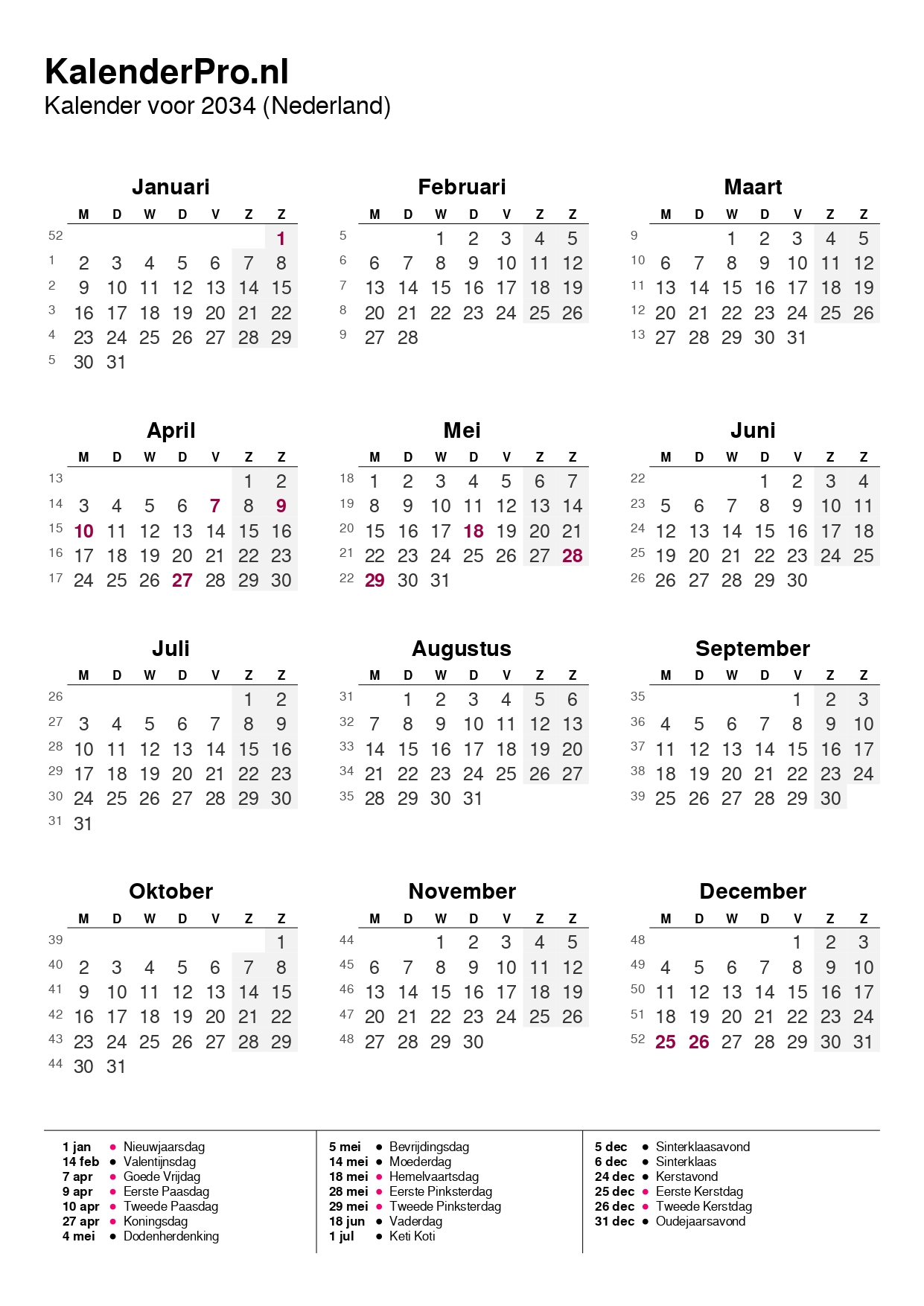 Wil je een duidelijke kalender 2034 met feestdagen om uit te printen voor thuis of op het werk?