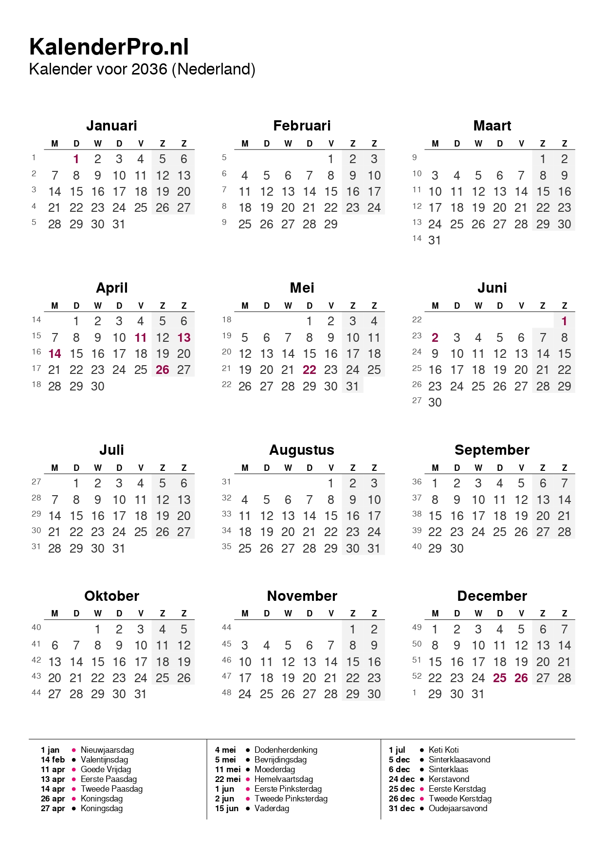 Wil je een duidelijke kalender 2036 met feestdagen om uit te printen voor thuis of op het werk?