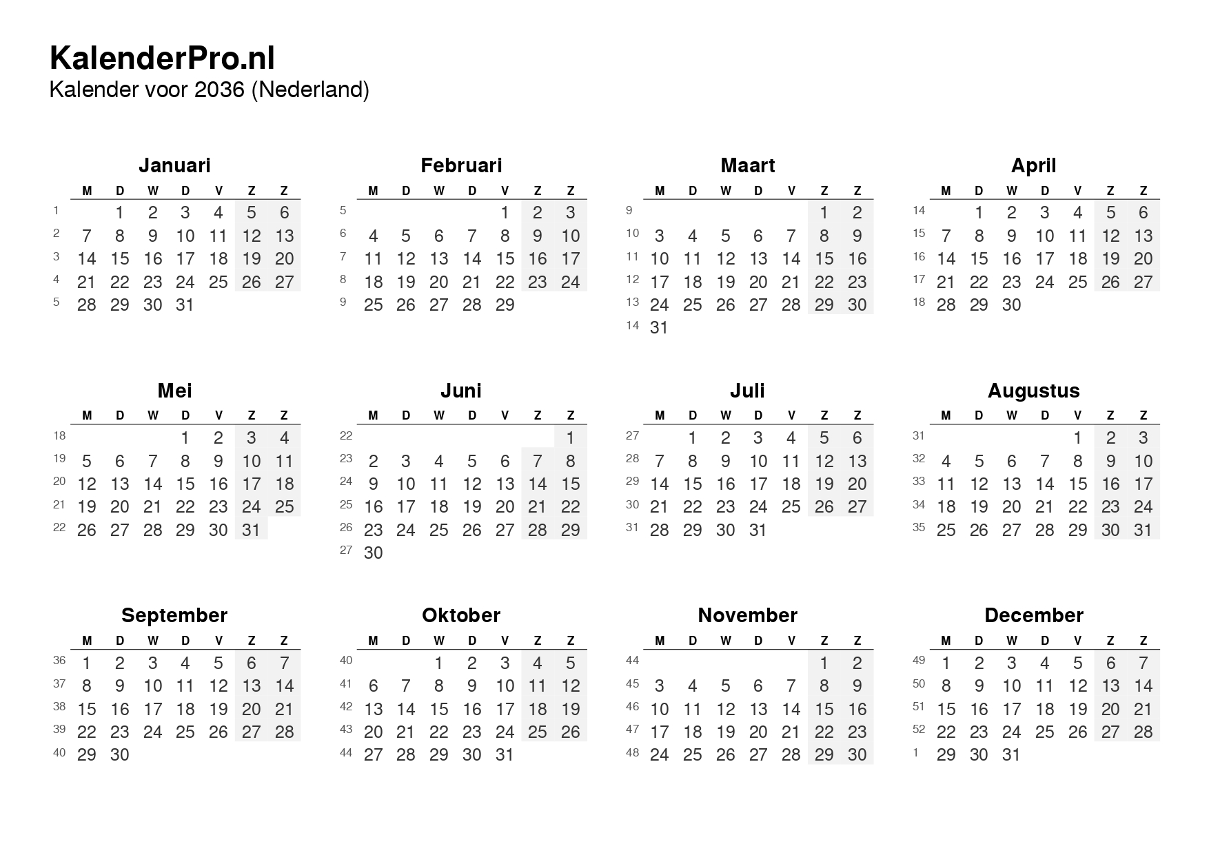 Bekijk hieronder het volledige overzicht van de kalender 2036: