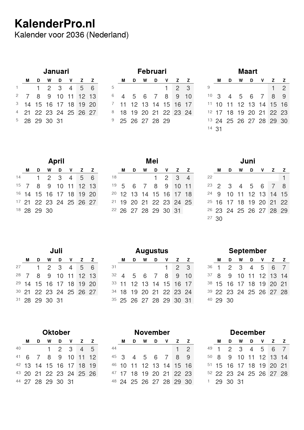 De kalender 2036 geeft je in één oogopslag een compleet overzicht van alle maanden, weeknummers en officiële feestdagen van het jaar. Of je nu wilt weten op welke dag een datum valt, je vakantie wilt plannen, of gewoon overzicht wilt houden over het jaar – hier vind je alles handig bij elkaar.