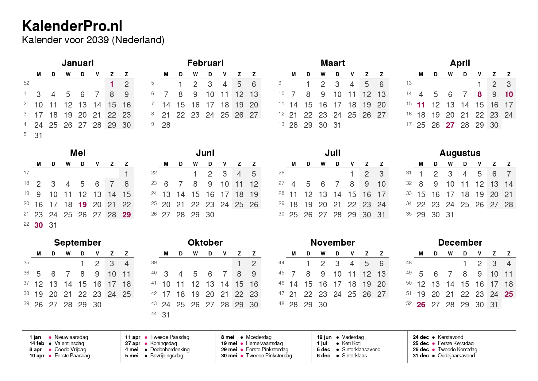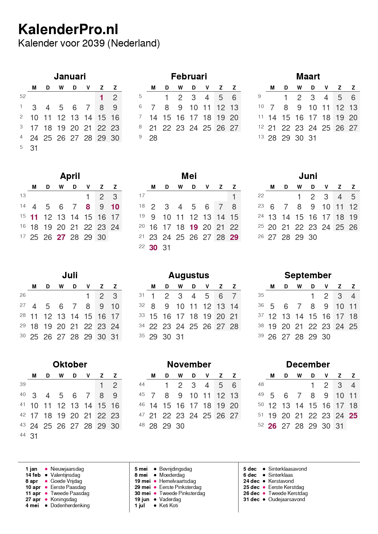 Wil je een duidelijke kalender 2039 met feestdagen om uit te printen voor thuis of op het werk?