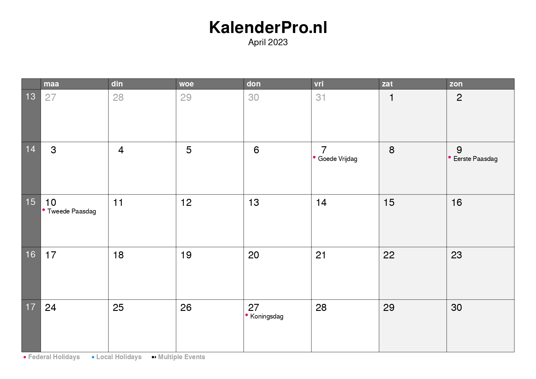 Deze kalender van april 2023 is handig om snel te zien wanneer je vakantie, vrije dagen of belangrijke afspraken hebt.