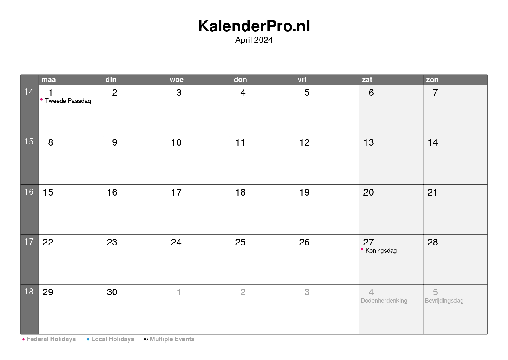 Bekijk hier de maandkalender van april 2024 met een compleet overzicht van alle dagen, weeknummers en feestdagen.