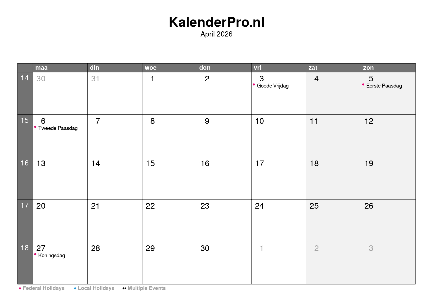 Deze kalender van april 2026 is handig om snel te zien wanneer je vakantie, vrije dagen of belangrijke afspraken hebt.