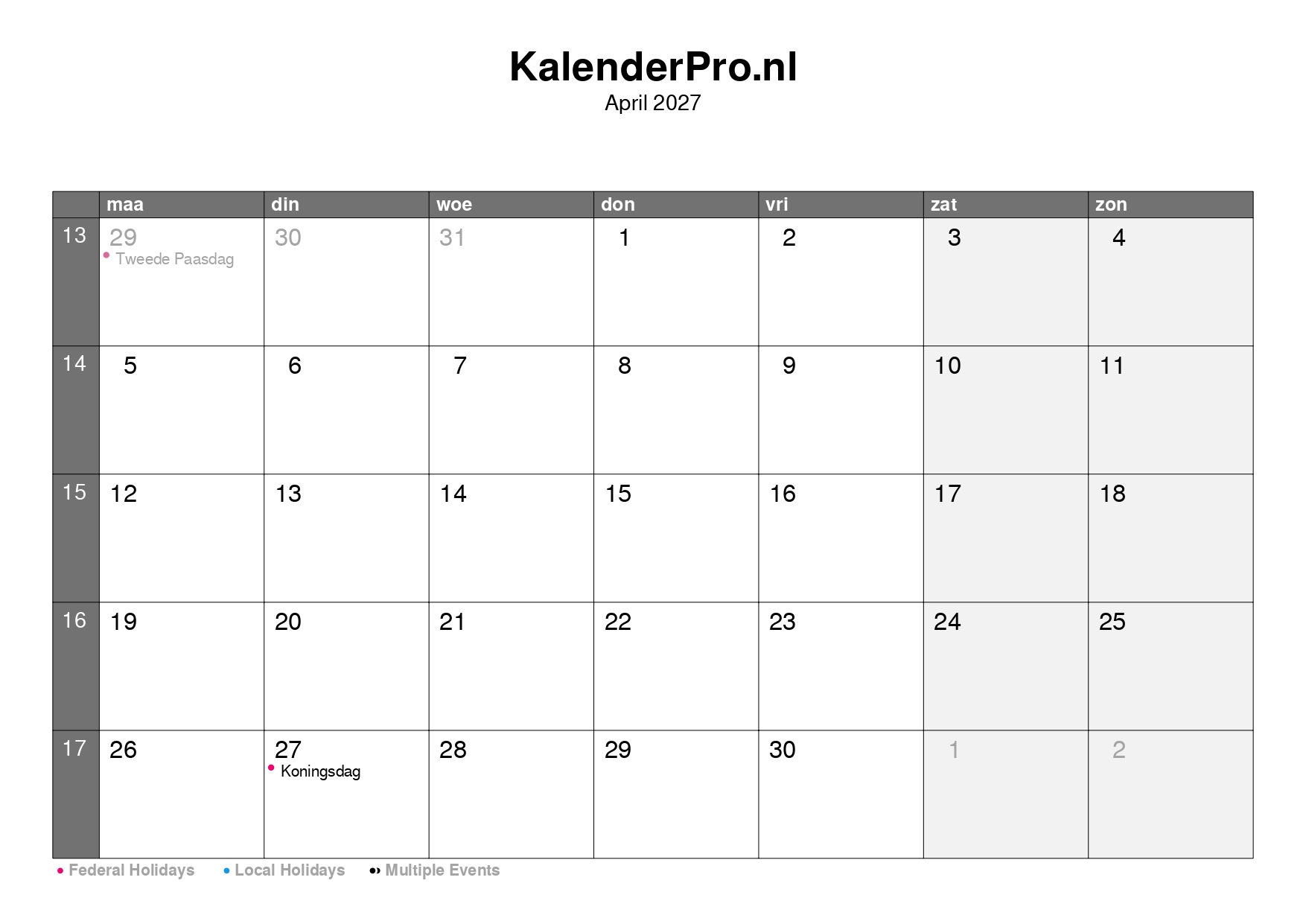 Deze kalender van april 2027 is handig om snel te zien wanneer je vakantie, vrije dagen of belangrijke afspraken hebt.