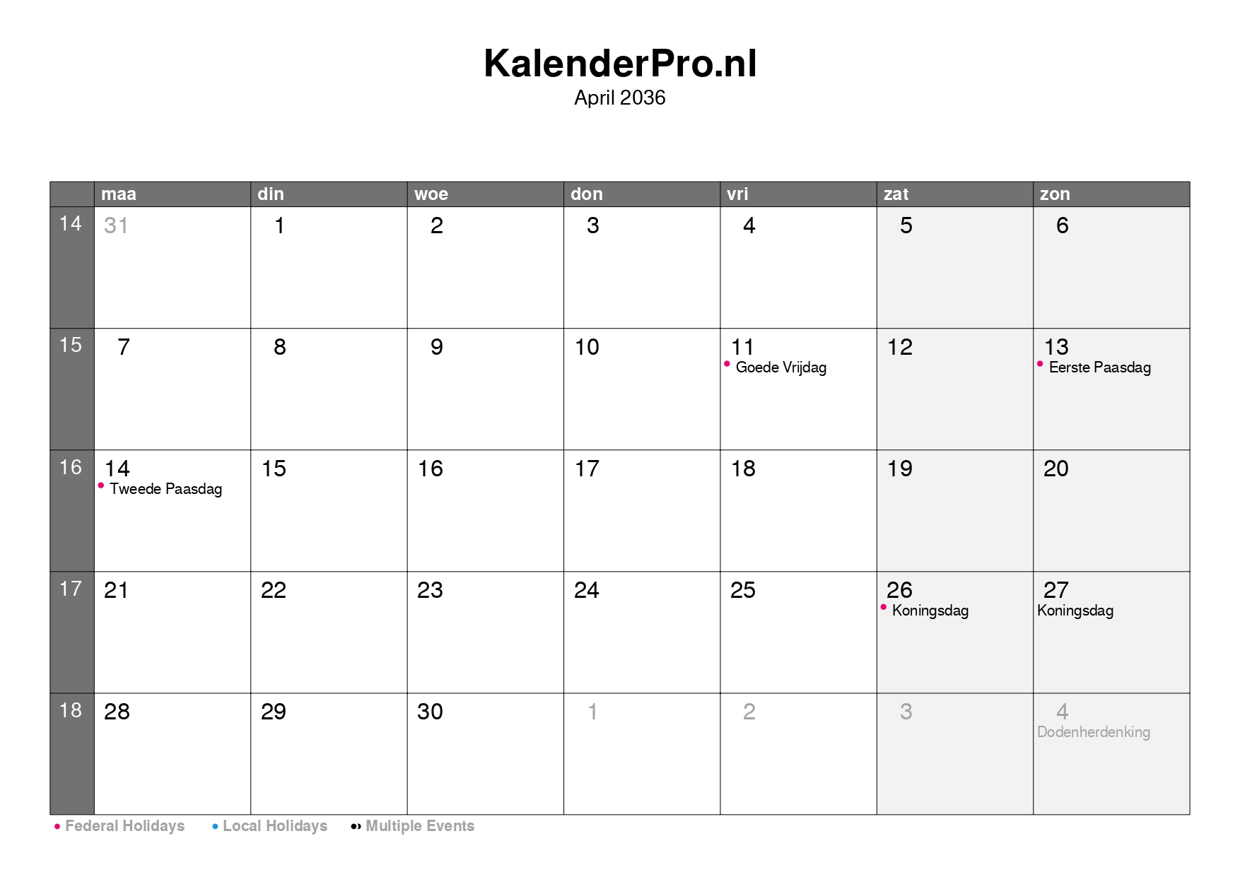Handig als je snel wilt zien op welke dag een datum valt of je je planning voor de maand april 2036 wilt voorbereiden.