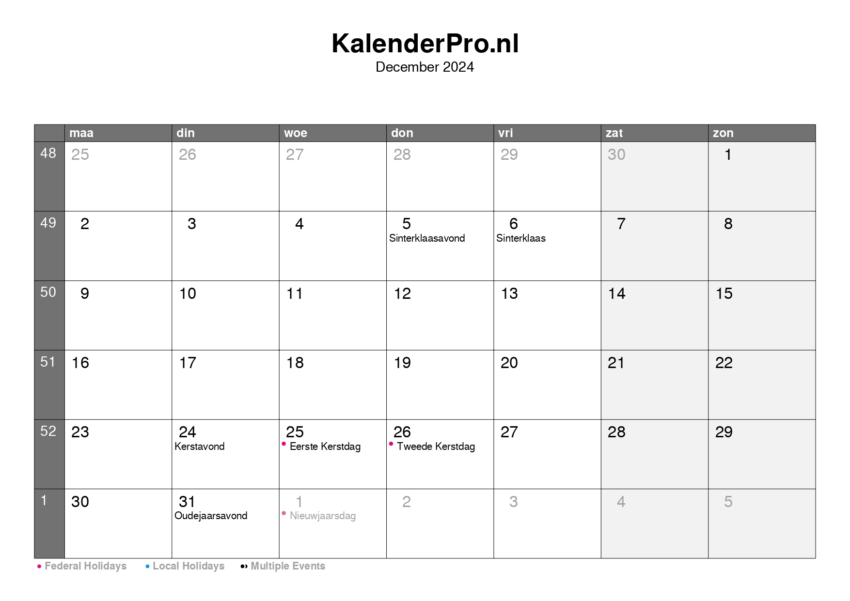 Bekijk hier de maandkalender van december 2024 met een compleet overzicht van alle dagen, weeknummers en feestdagen.