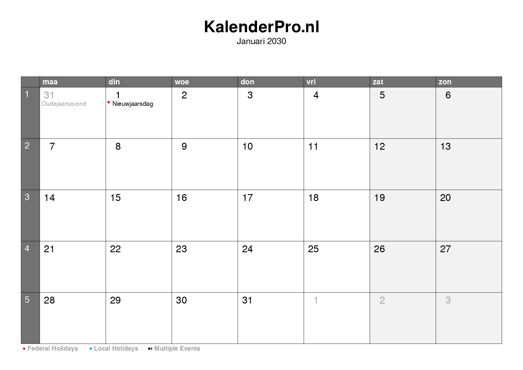 Handig als je snel wilt zien op welke dag een datum valt of je je planning voor de maand januari 2030 wilt voorbereiden.