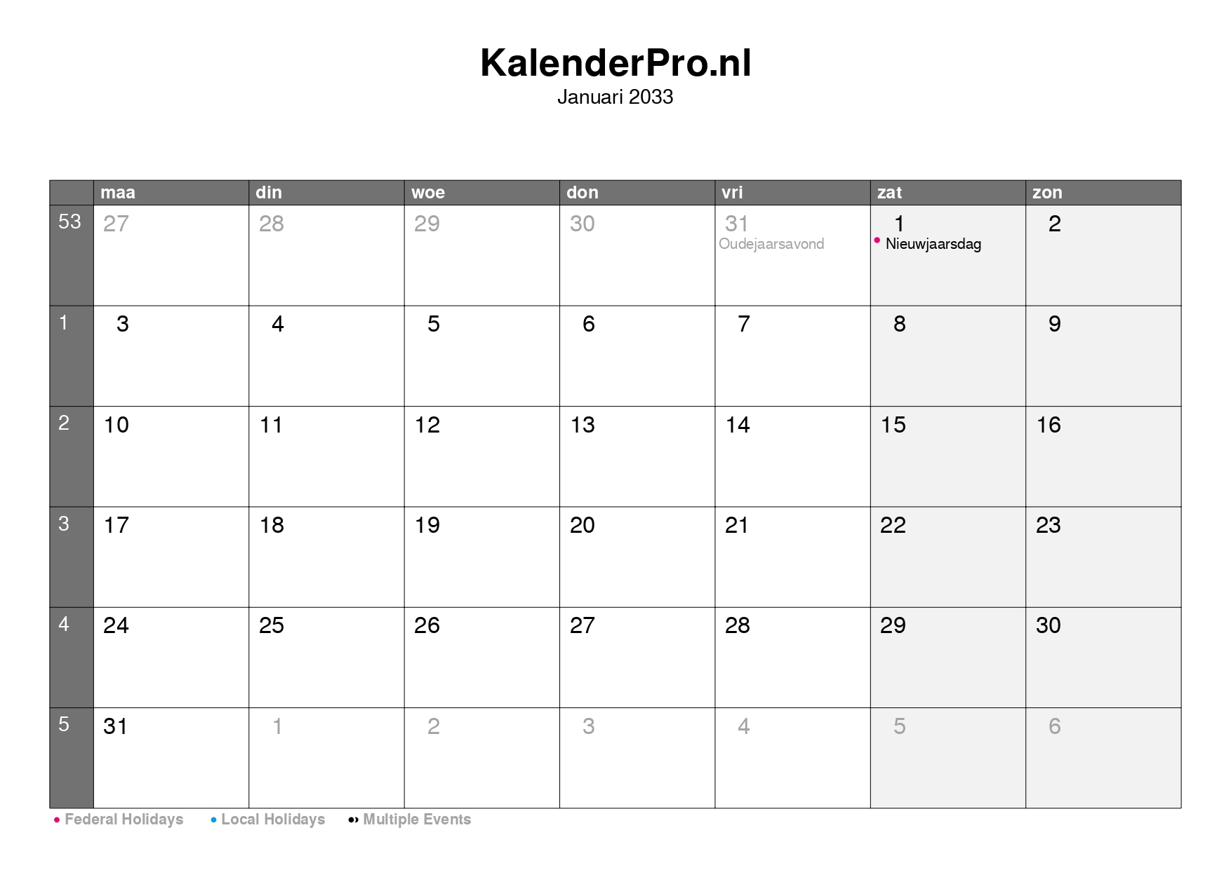 Deze kalender van januari 2033 is handig om snel te zien wanneer je vakantie, vrije dagen of belangrijke afspraken hebt.