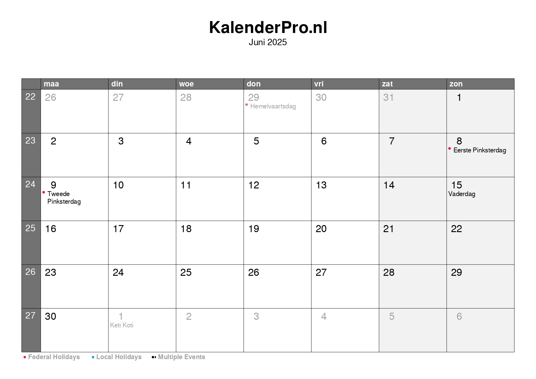 Bekijk hier de maandkalender van juni 2025 met een compleet overzicht van alle dagen, weeknummers en feestdagen.