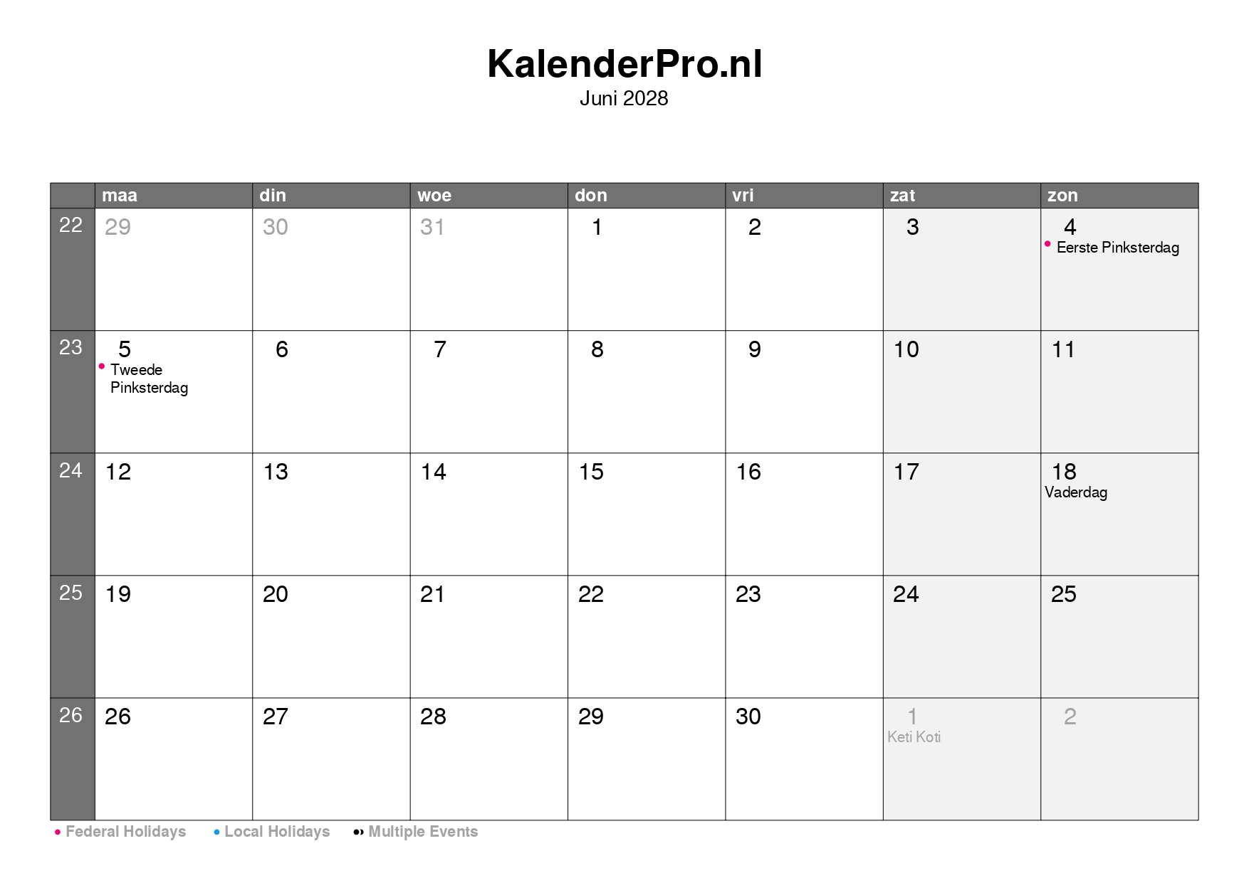 Bekijk hier de maandkalender van juni 2028 met een compleet overzicht van alle dagen, weeknummers en feestdagen.