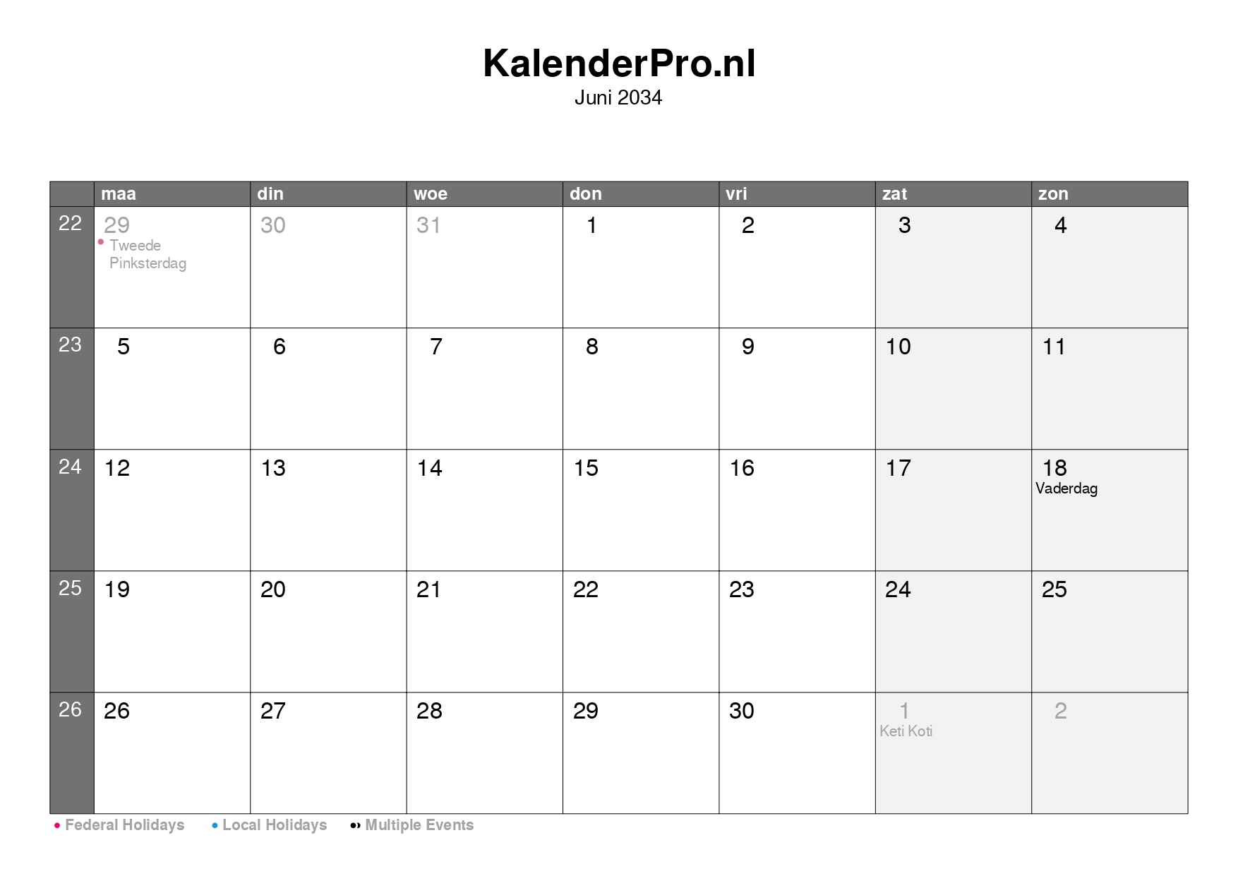 Bekijk hier de maandkalender van juni 2034 met een compleet overzicht van alle dagen, weeknummers en feestdagen.