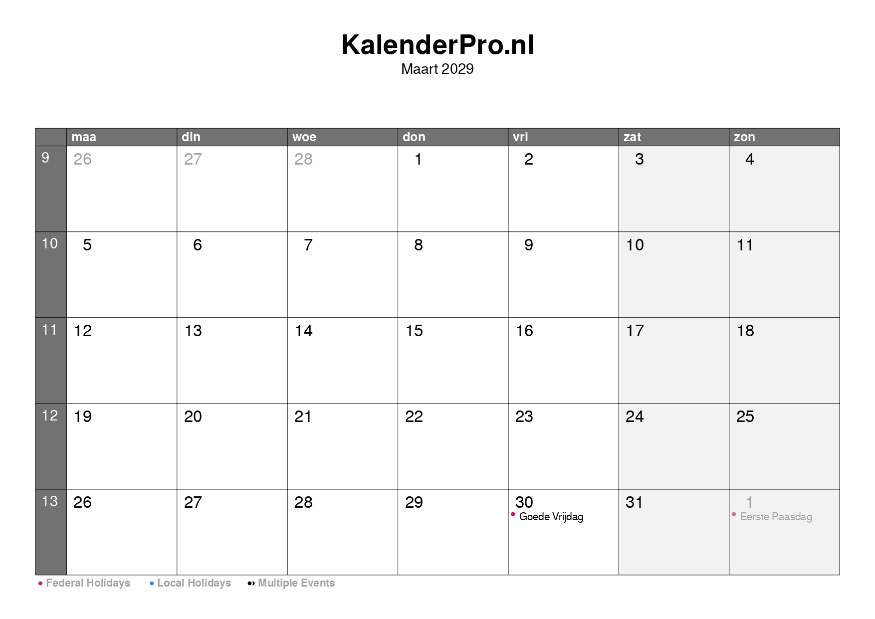 Deze kalender van maart 2029 is handig om snel te zien wanneer je vakantie, vrije dagen of belangrijke afspraken hebt.
