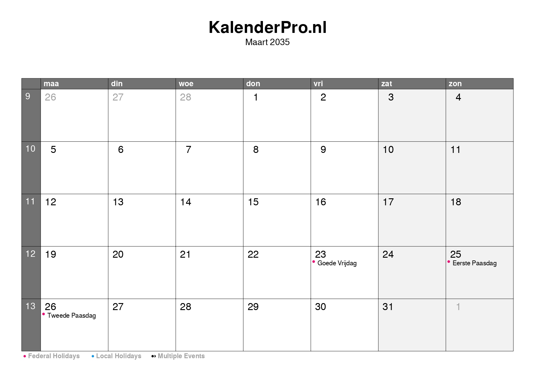 Handig als je snel wilt zien op welke dag een datum valt of je je planning voor de maand maart 2035 wilt voorbereiden.