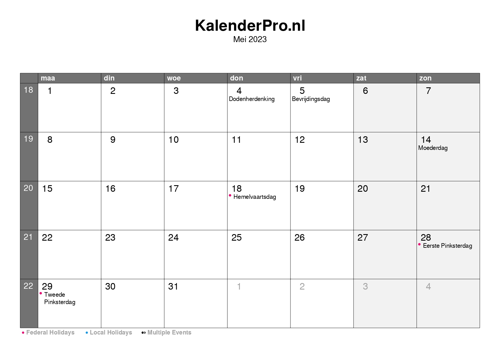 Bekijk hier de maandkalender van mei 2023 met een compleet overzicht van alle dagen, weeknummers en feestdagen.