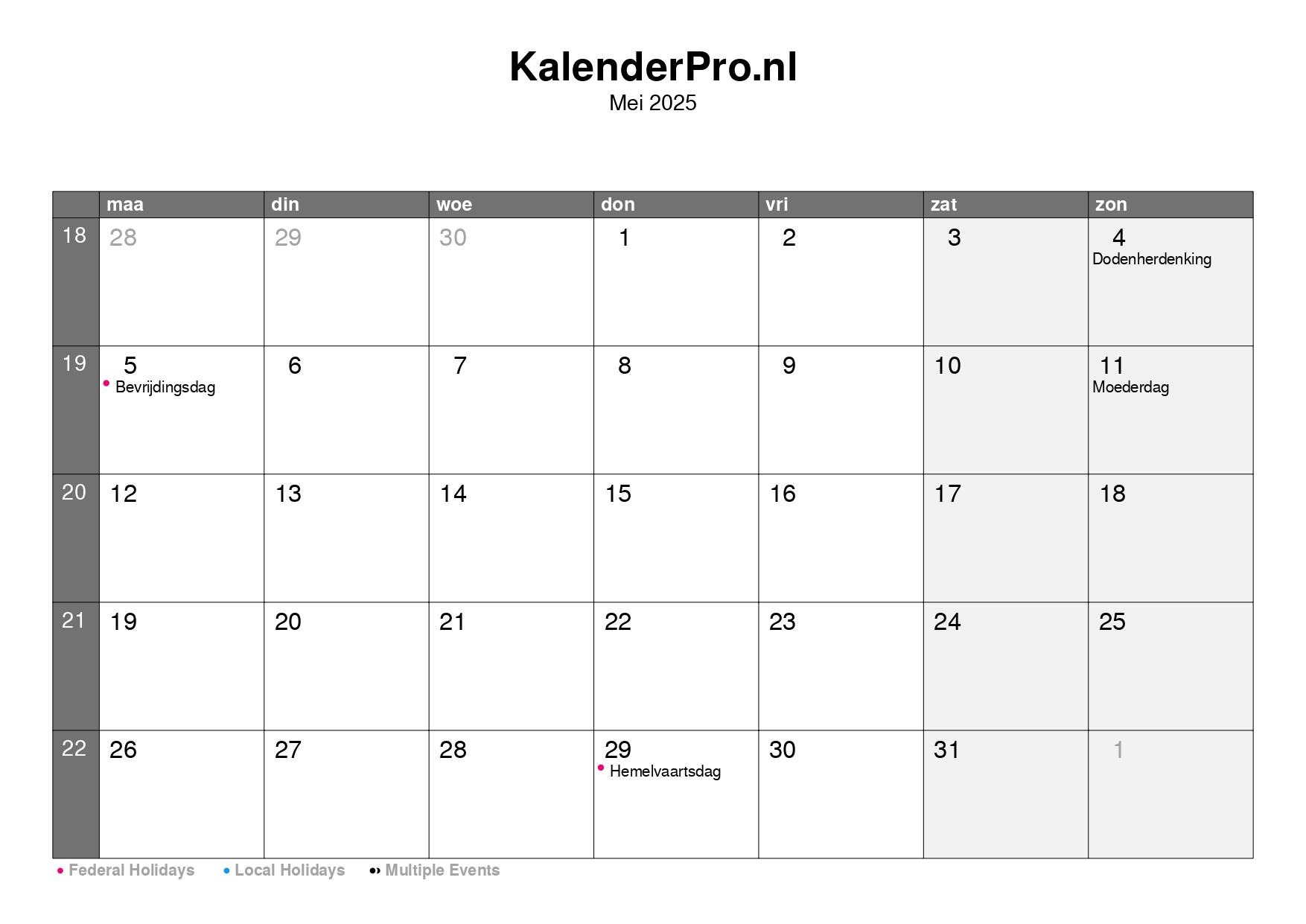 Bekijk hier de maandkalender van mei 2025 met een compleet overzicht van alle dagen, weeknummers en feestdagen.