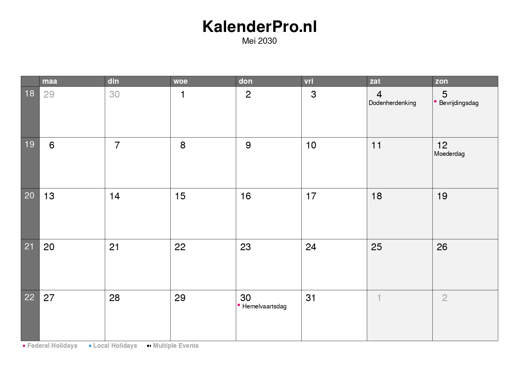 Handig als je snel wilt zien op welke dag een datum valt of je je planning voor de maand mei 2030 wilt voorbereiden.