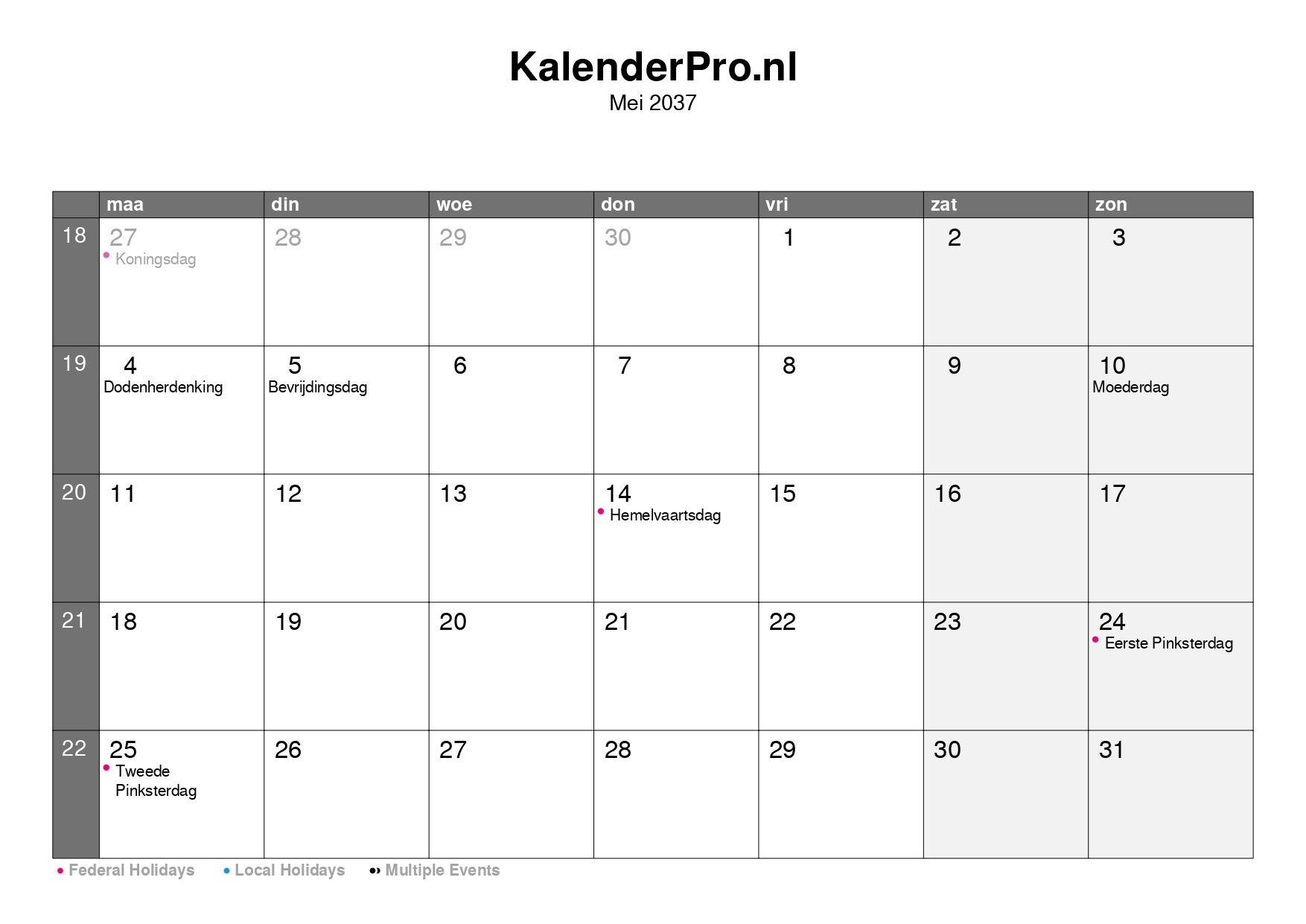 Handig als je snel wilt zien op welke dag een datum valt of je je planning voor de maand mei 2037 wilt voorbereiden.