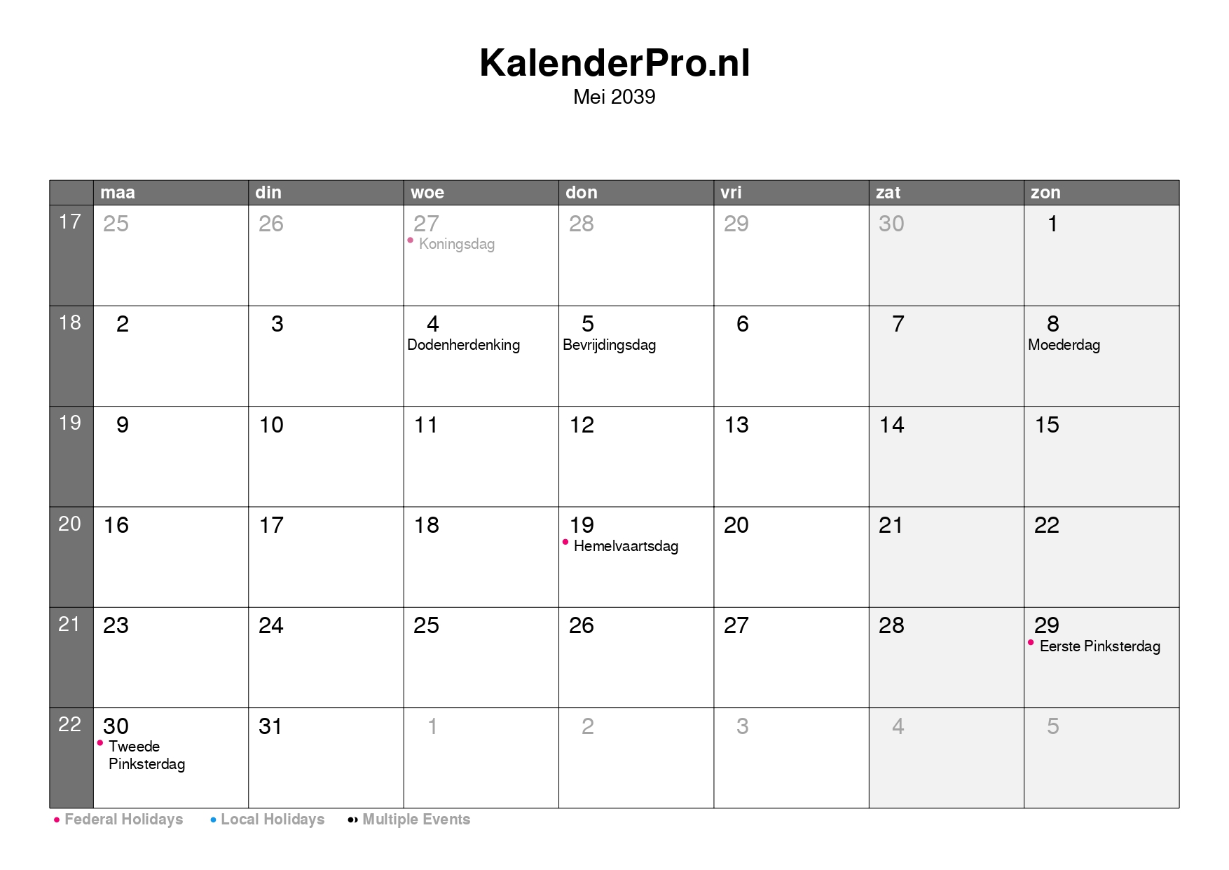 Handig als je snel wilt zien op welke dag een datum valt of je je planning voor de maand mei 2039 wilt voorbereiden.