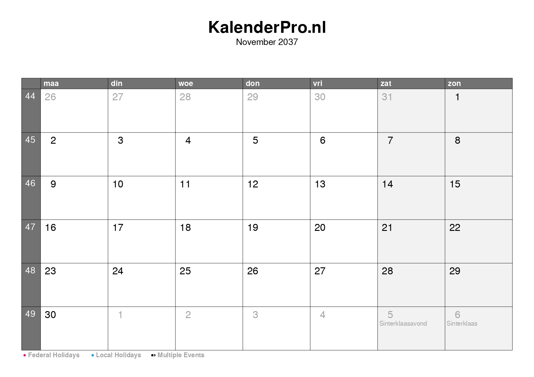 Bekijk hier de maandkalender van november 2037 met een compleet overzicht van alle dagen, weeknummers en feestdagen.